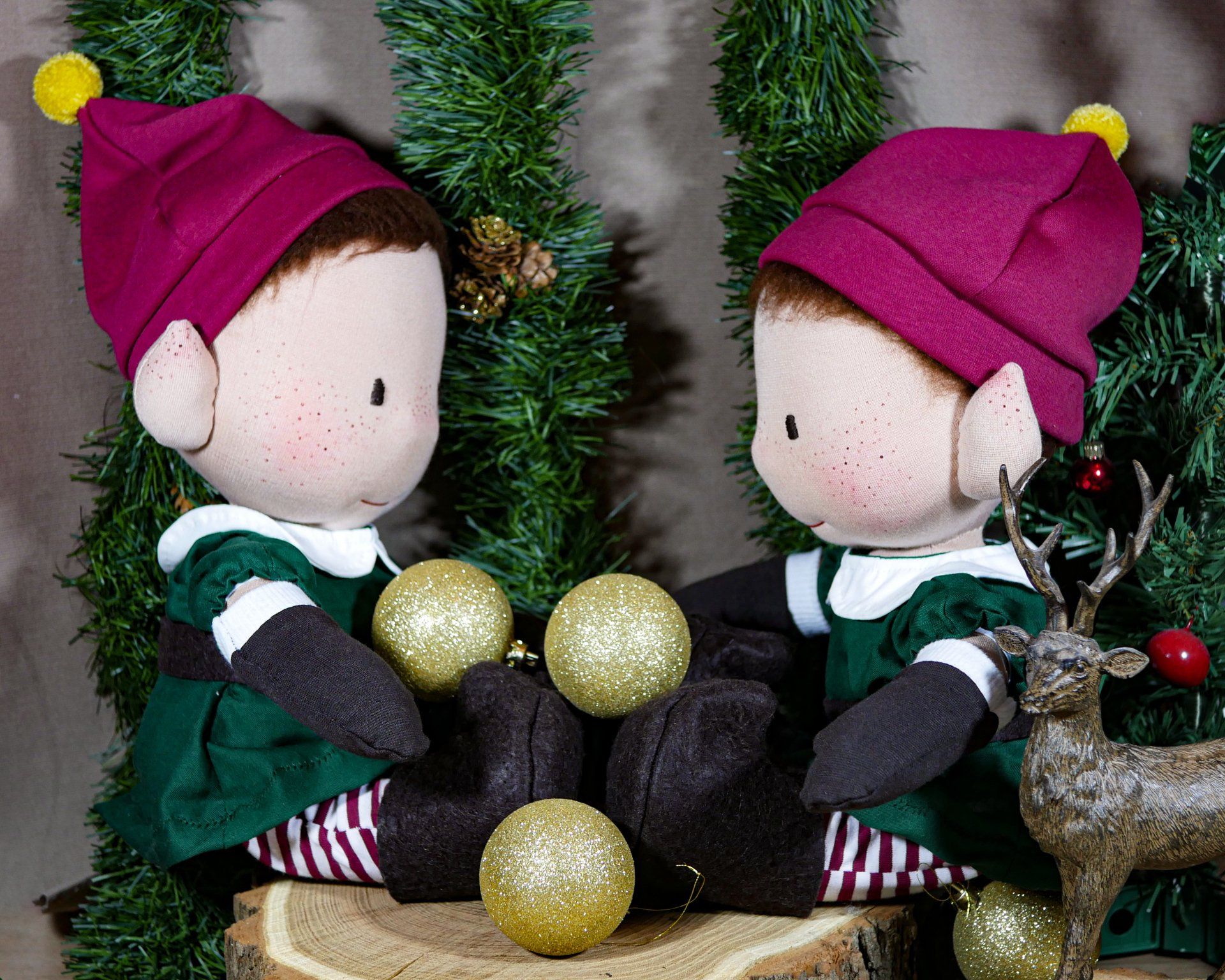 Wichtel Elwin, our little gnome boy from our self-published book "Wichtel Elwin und das Weihnachtsgewarte" was brought to life by us twice for Christmas! The "Wichtelbrüder" are 45cm high, wear brown felt shoes, a brown felt belt and gloves, red and white striped tights, a green shirt with a white Peter Pan collar and a red cap with a yellow bobble.