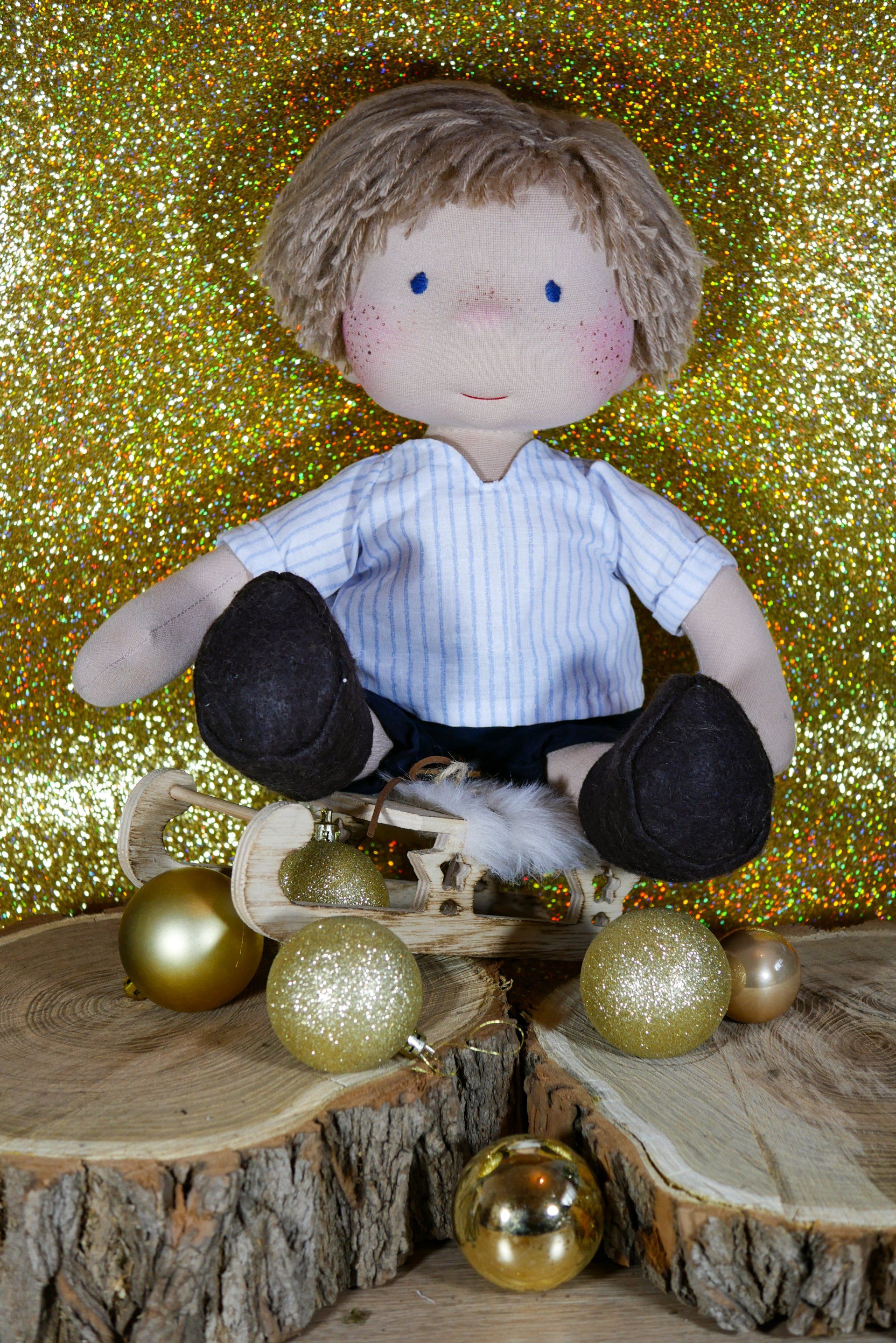 Freya is a 50 cm tall rag doll and a real elf girl. She has pointed ears, light brown skin tone and light blonde hair tied back with turquoise ribbons. She wears brown felt shoes, orange striped tights, orange leg warmers and a scarf of the same color. Her blouse has a beautiful Christmas pattern with gold accents and she wears an orange corduroy bib skirt that is held up with white snaps.
